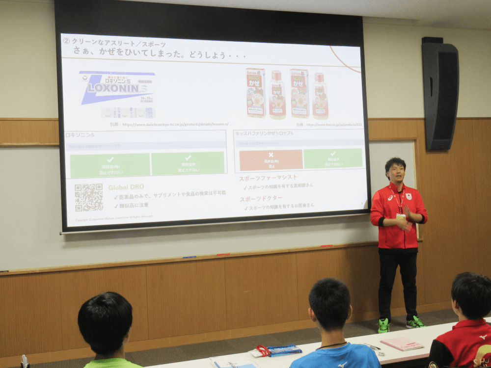 夕食後のミーティングでは、リュージュでオリンピック出場経験を持ち、JOCアンチドーピング委員を務める小口貴久さんによる、アンチドーピングについての講義が行われた